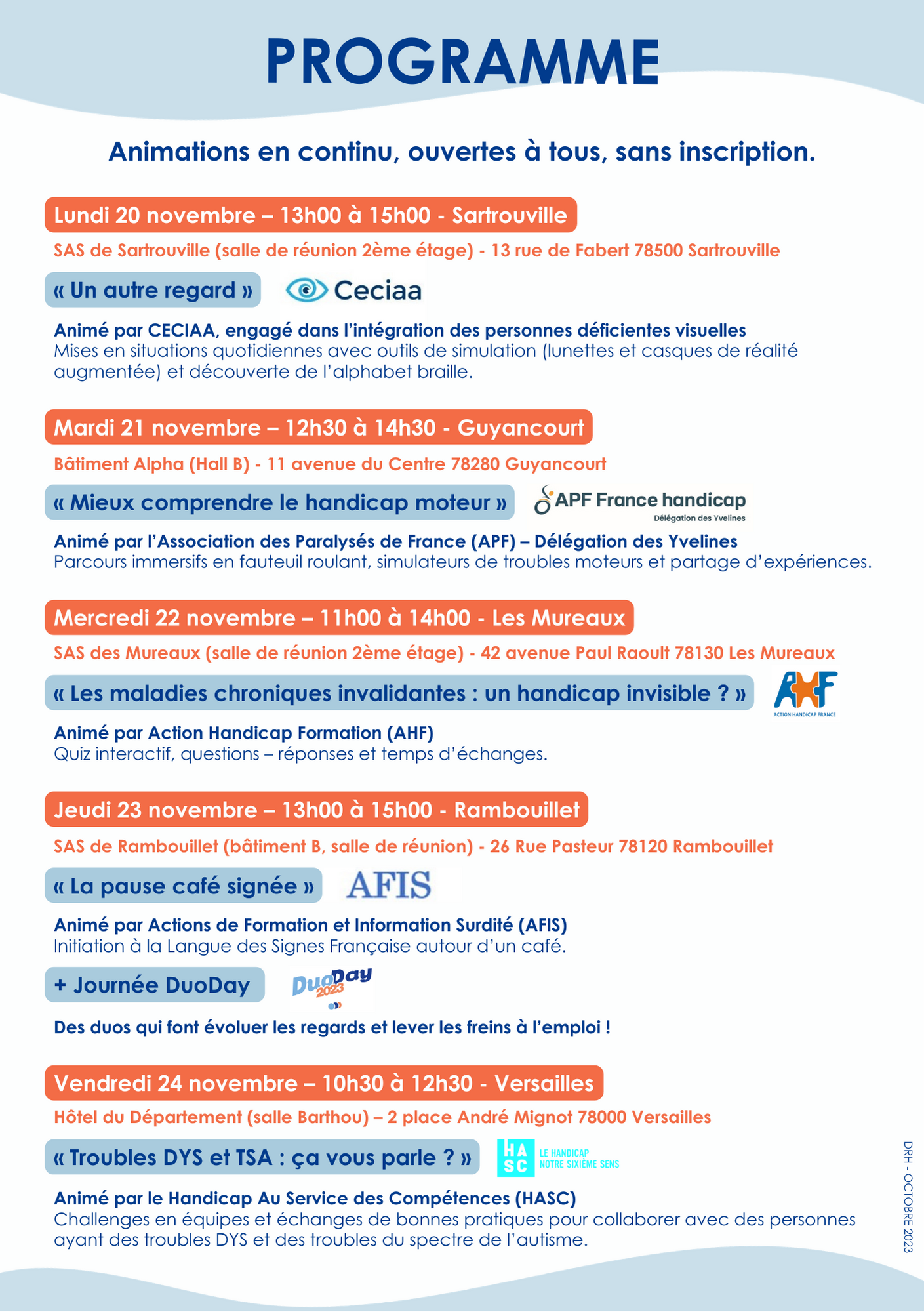 À cette occasion, nous proposons à tous les collaborateurs de participer à des animations en continu, organisées tout au long de la semaine et sur tout le territoire, sans inscription.