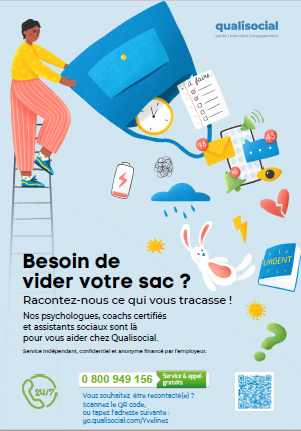 Prenez soin de vous et de vos collègues. Si vous êtes témoin d’un coup de mou d’un de vos collègues et que vous souhaitez l’aider, ne le faites pas seul, conseillez-lui Qualisocial.